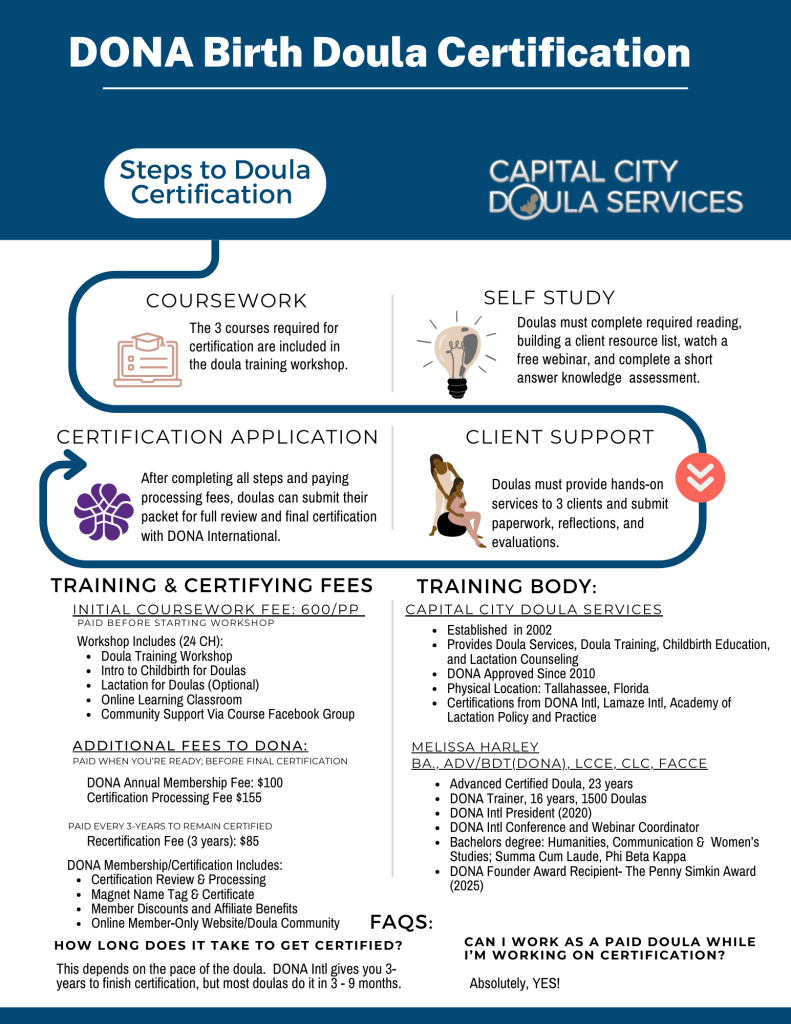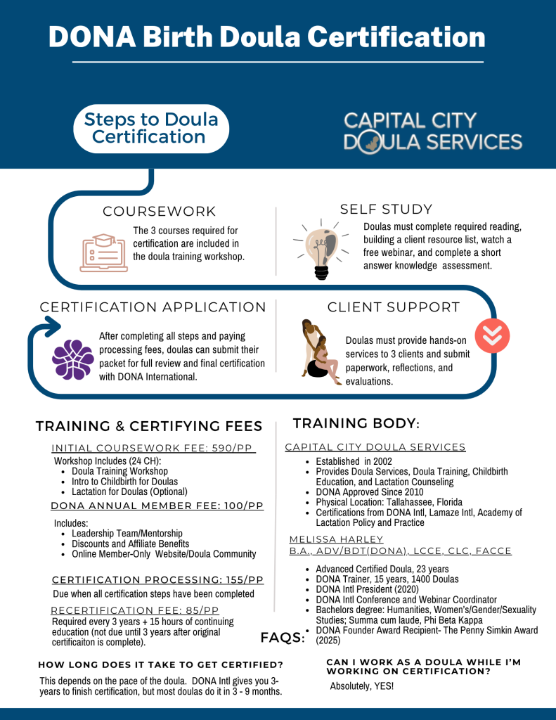 DONA Birth Doula Certification Information The DONA Approved Birth Doula workshop is the first step to doula certification with DONA International. Register Here